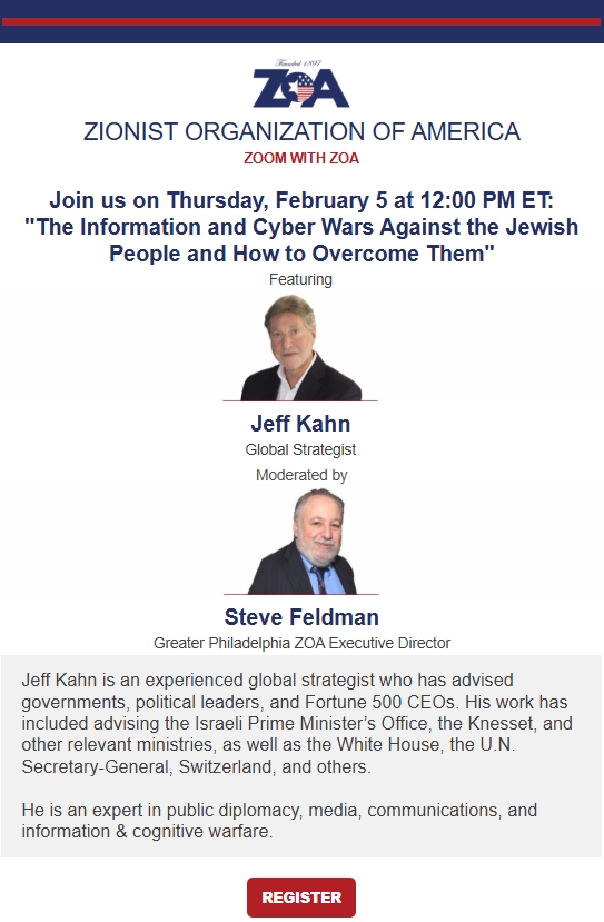 Greater Philadelphia ZOA and National ZOA will shed light on this Information War – also called the Cognitive War – and offer ways you can both defend yourself and fight back in it via a special webinar next Thursday, Feb. 5, at noon EST. Our executive director, Steve Feldman, will have a conversation with leading Israeli strategist and expert on the Information War Jeffrey Kahn. The subject: ““The Information and Cyber Wars Against the Jewish People – and How to Overcome Them.”